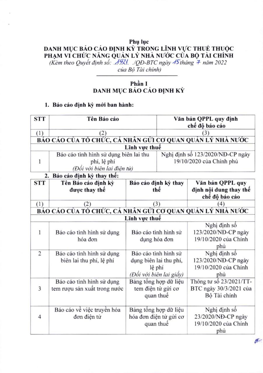 Ngày 15/7/2022, Bộ trưởng Bộ Tài chính ban hành Quyết định số 1421/QĐ-BTC công bố danh mục báo cáo định kỳ trong lĩnh vực thuế thuộc phạm vi quản lý của Bộ Tài chính.